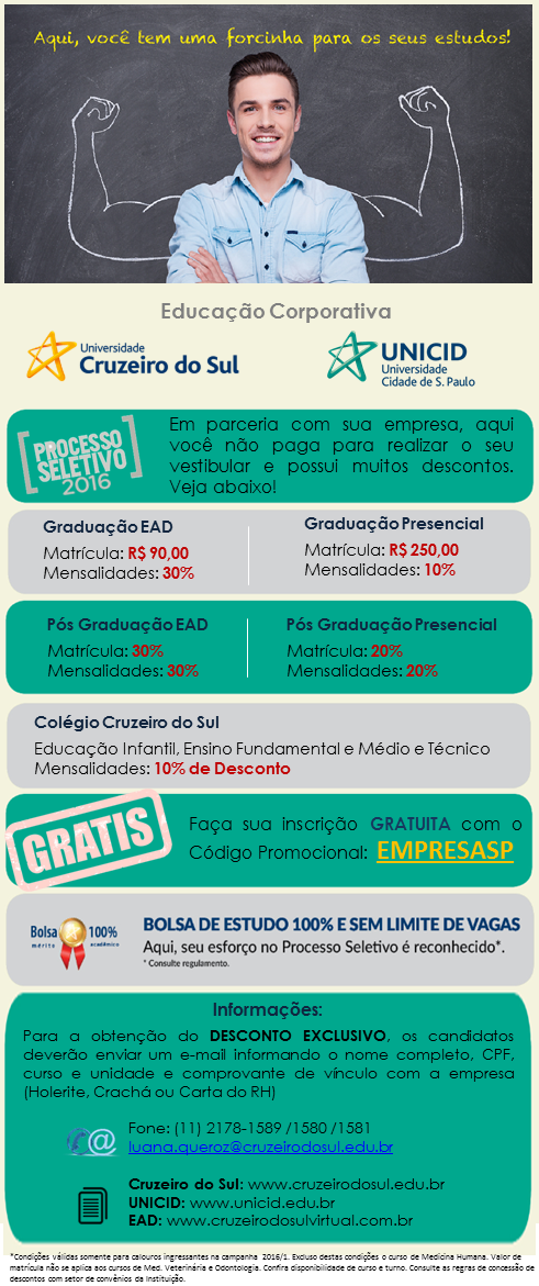 A parceira da Afalesp, Universidade Cruzeiro do Sul, disponibiliza condições especiais para associados no processo seletivo 2016 para diversos cursos. Para se beneficiar, é necessário que o associado solicite a carta comprovante na Afalesp, pessoalmente ou pelo telefone, e envie para a Universidade (endereço em destaque no cartaz) junto com o nome completo, CPF, curso que deseja se matricular e unidade. Confira no cartaz os descontos e processos.