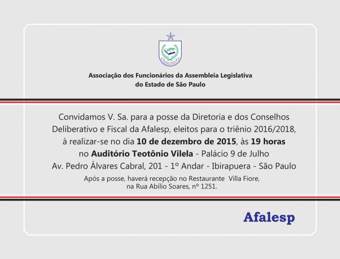A Afalesp convida os servidores da Casa para participarem da cerimônia de posse da nova diretoria da associação. Sua presença é muito importante!