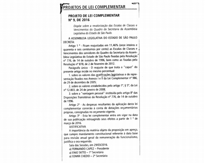Foi aprovada nesta quarta-feira, 30/3, a urgência para o Projeto de Lei Complementar 9/2016, que trata do reajuste salarial para os servidores da Assembleia para 2016 (veja na imagem a íntegra do texto). A tramitação em regime de urgência agiliza a votação da matéria.
