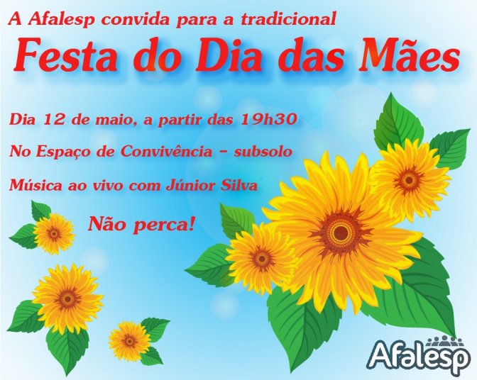 Notícias Festa do Dia das Mães será no dia 12/5 segunda-feira, 9 de maio de 2016domingo, 9 de abril de 2023 afalesp Por conta da ocupação dos estudantes na semana passada, a Afalesp decidiu adiar a comemoração do Dia das Mães. O nova data ficou definida para a próxima quinta-feira, 12/5. A festa será no espaço de convivência da Casa, no subsolo. Venha saborear deliciosos crepes suíços e curtir o som do cantor Júnior Silva!