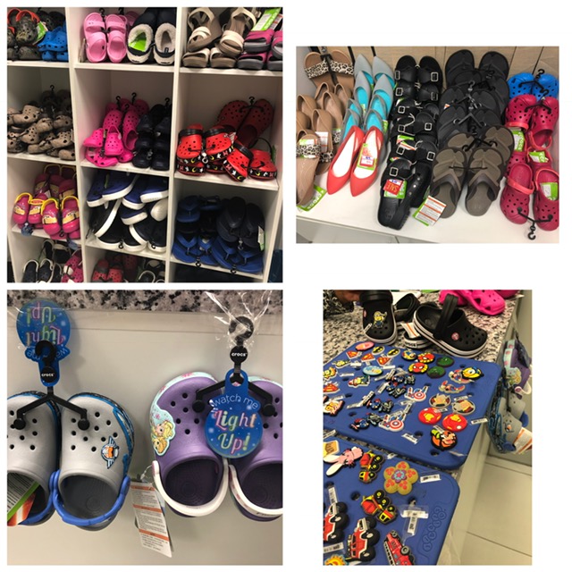 Produtos: Conhecidos calçados crocs, de resina, macios, confortáveis, leves, antimicrobiais, resistentes ao odor e que não marcam o piso, disponíveis em uma grande variedade de cores e estilos. Toda a loja com desconto de 30% a 40% de desconto.
