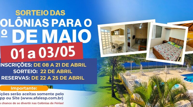 🌟 SORTEIO ABERTO! 🌟 Já pensou em curtir o feriado de 1º de Maio com descanso garantido nas colônias da
