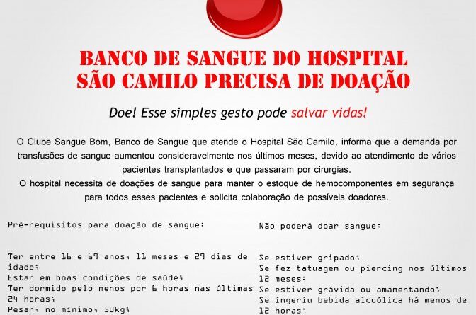 Banco de sangue do Hospital São Camilo precisa de doação