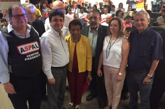 Deputada Leci Brandão e senador Paulo Paim entre Gaspar Bissolotti, da Aspal, Hélio Freire, do Sindaf-SP, Rita Ferraro e Joacy
