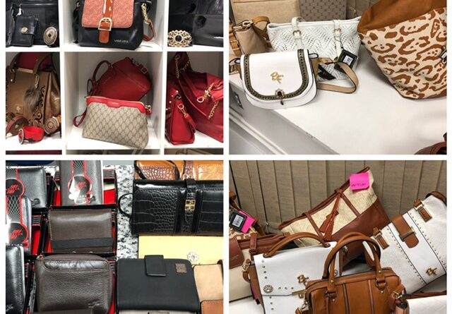 Produtos: Bolsas de várias marcas, carteiras femininas e masculinas, opções de maquiagem para pernas "meia calça spray".